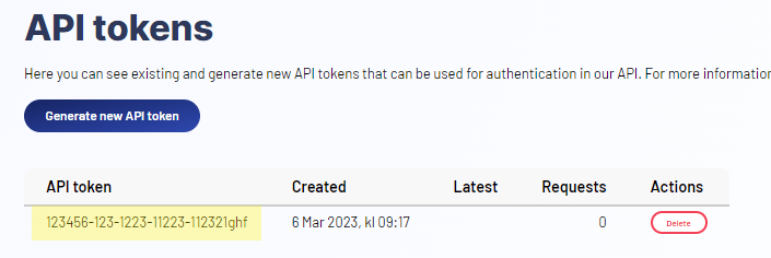 If you don't have an API token available, click on Generate new token button: