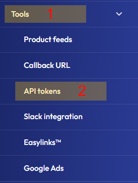 Sign in to your addrevenue.io publisher account, on the left menu, click on Tools (1) and API Tokens (2):