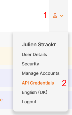 2. To find your API Key, click on the menu icon on the top right (1) and select API Credentials (2):