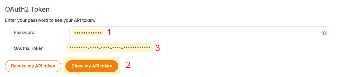 Then, enter your password (1), click the Show my API token button (2) to reveal your token, then copy (3) the token and paste it into Strackr: